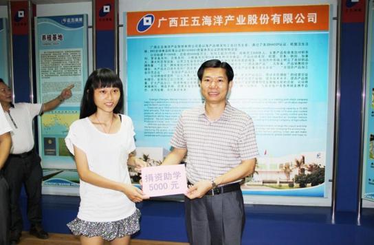 2013年8月29日上午,北海市銀海區委宣傳部、區團委、建設局,銀灘鎮黨委、社會保障服務中心、鎮團委在正五公司為家住銀灘鎮北背嶺村的高考生林慶真舉行了一場簡潔而隆重的捐資助學儀式。董事長黃禮雄代表正五公司向林慶真捐款5000元,銀灘鎮各界也向林慶真捐款5000元。